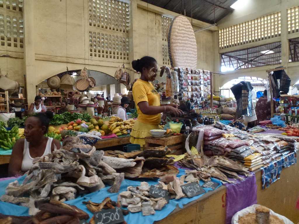 マダガスカル語で ノシ は島を意味し ベ は大きいを意味する周辺で最も大きな島のノシベの中心地エルビルの市場